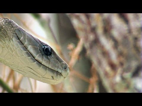 http://Ojatro.comhttp://Ojatroblog.blogspot.comBlack Mambas feed mostly on smaller warm blooded mammals, such as rats, mice, hyraxes and even bushbabies. These snakes are agile enough to ambush and catch birds and bats out of the air and do so frequently in trees or near water holes. Mambas do feed occasionally on other reptiles, such as lizards and venomous snakes, including puff adders and cobras. After ingestion, powerful acids digest the prey, sometimes within eight to 12 hours depending on its surrounding temperature. Black Mamba in tree was filmed by Heiko Kiera aka Ojatro in 2007.
