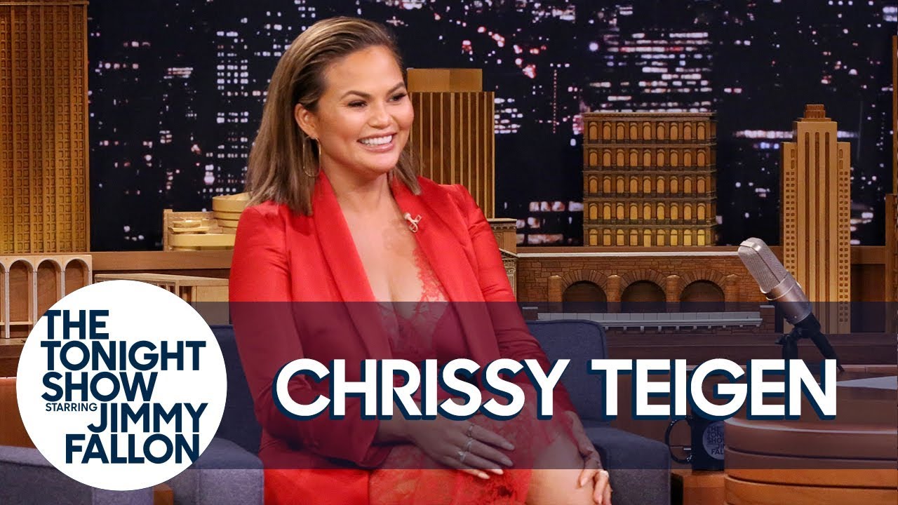 Chrissy Teigen challenges Jimmy to guess how pregnant she is, reveals how she ended up on her knees in the middle of the Grammy Awards in front of Beyoncé and why she has to fake emotion whenever her husband, John Legend, performs "All of Me."