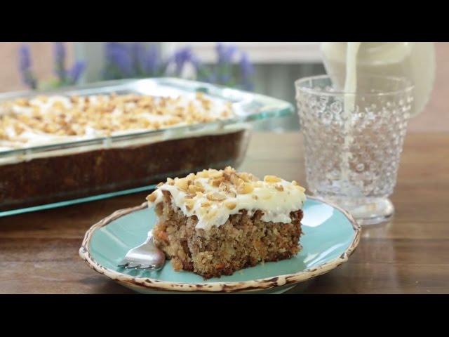 Watch how to bake a sweet, crunchy and chewy cake with carrots, walnuts, pineapple and coconut. We top this delicious confection with a fluffy cream cheese frosting. If you wish, try baking it in a muffin pan, or two round pans to stack into a layered cake.