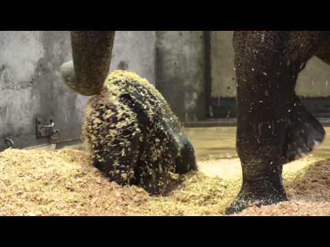 After a bath, Rose-Tu and her four day old calf enjoy a pile of fresh wood chips.