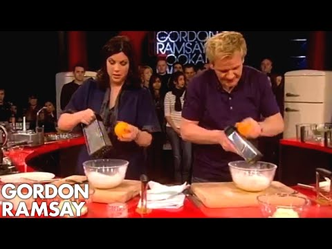 Gordon Ramsay shows Kirstie Allsopp and Chris Moyles how to make mandarin cheesecake topping on the Cookalong Live 70s special.