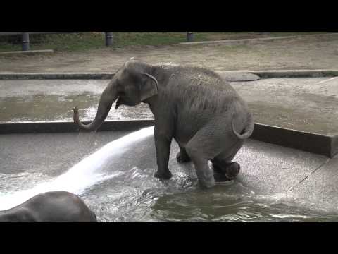 Elephants having fun in the pool in the Elephant Habitat at the Oregon Zoo.