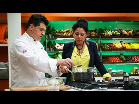 Chef Richard Rosendale melts chocolate in a "double boiler" by placing chunks in a mixing bowl over a pot of boiling water.