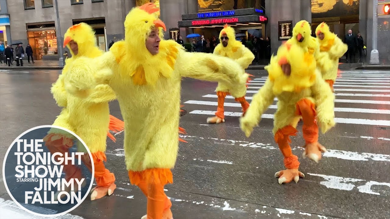Jimmy and his friends the Bawkstreet Boys attempt to cross the street after leaving the Tonight Show studio.